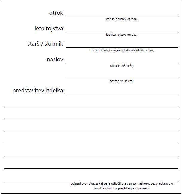 - pojasnilo starša/otroka, zakaj se je odločil prav za to maskoto, oz. predstavo o maskoti, kaj mu predstavlja in pomeni